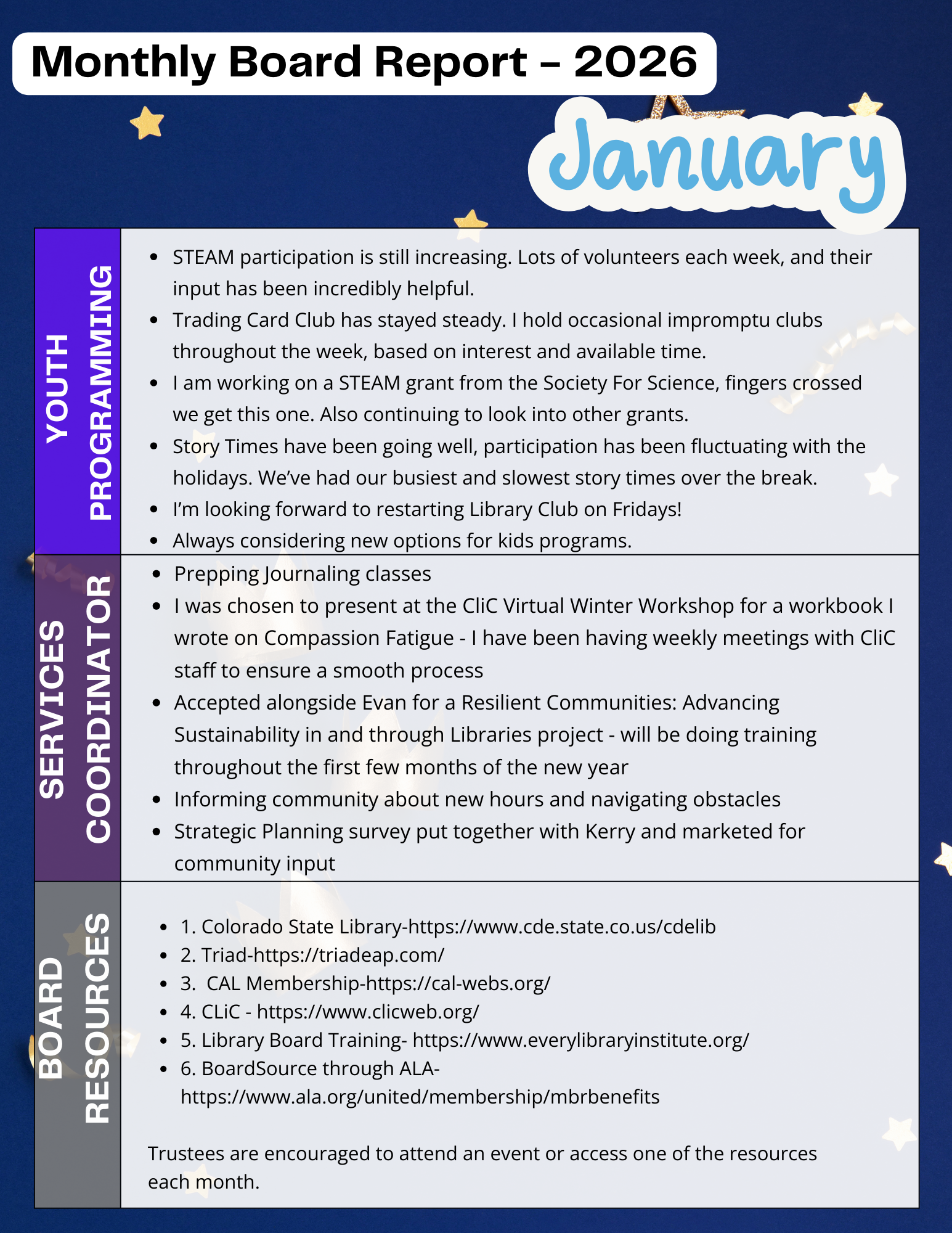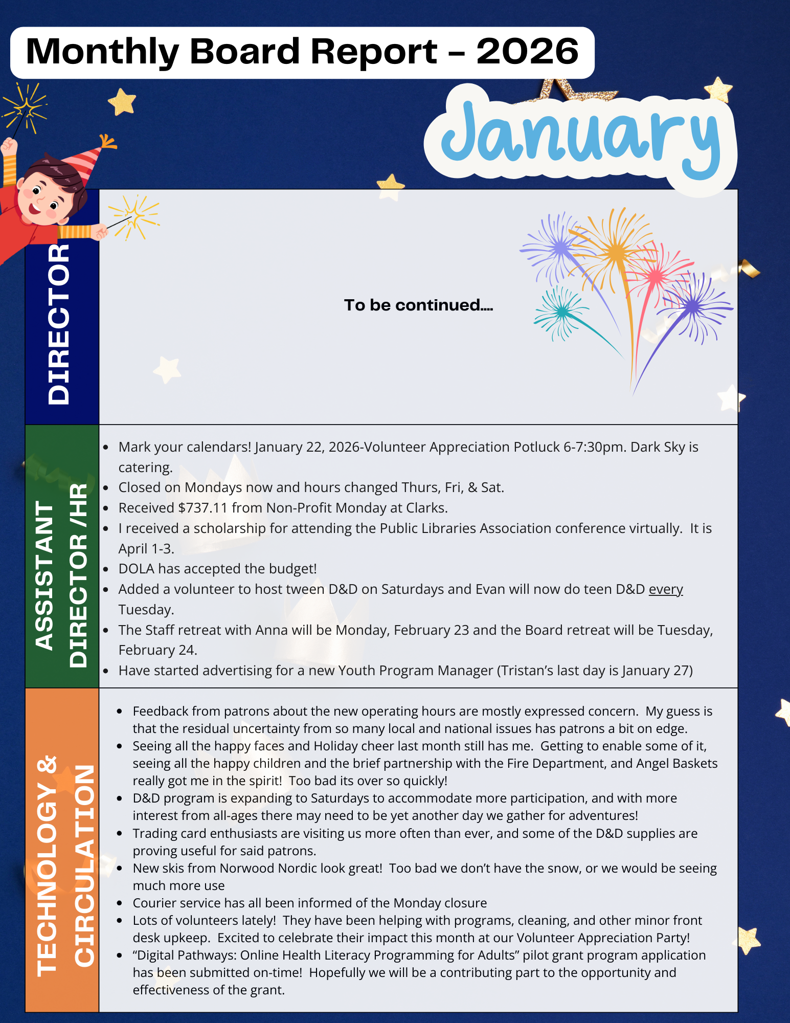 Jan192026 Board Meeting Agenda Dec 2025 Budget vs Actuals.pdf Dec 2025 Statement of Activity_Profit & Loss.pdf Dec 2025 Statement of Financial Position_Balance Sheet.pdf 01.2026 Board Report pg 2.png 01.2026 Board Report pg 1.png 2025 Stats for Lone Cone Library Dec 2025.pdf Mission, Vision, Values 2026.pdf